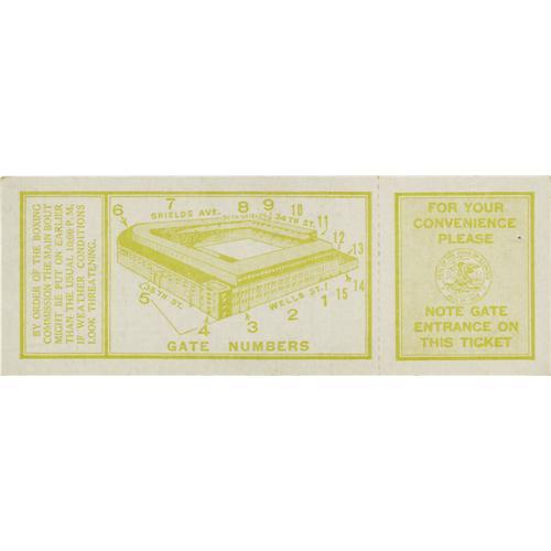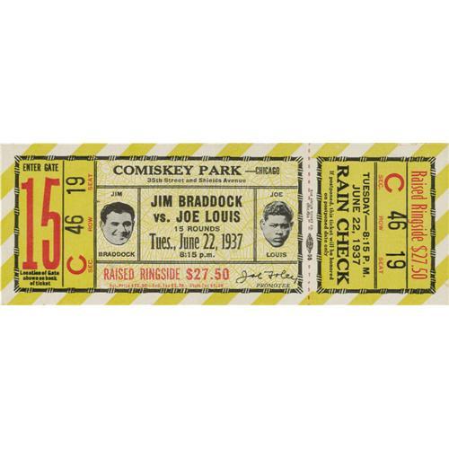 <B>1937 Louis vs. Braddock Full Ticket.</B></I> On June 22, 1937, Joe Louis finally got his title shot when he fought and defeated Jimmy Braddock to win the World Heavyweight Championship. The fight was held in Comiskey Park in Chicago. Louis survived an early knockdown to come back and stop Braddock by knockout in the eighth round. Presented here is a full, official ticket to this event. This ticket is in tremendous condition with strong color, slightly rounded corners and exceptionally clean front and back. It is uncreased and measures 2.5x7". A wonderful head shot of both fighters adorns this scarce and desirable full ticket. <I>LOA from Craig Hamilton / JO Sports.</B></I>