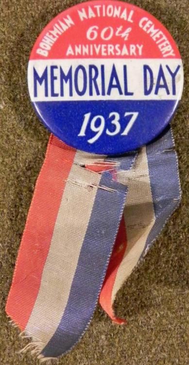 OFFERED HERE IS A1937 MEMORIAL DAY BUTTON WHICH MARKED THE 60THANNIVERSARY OF THE BOHEMIAN NATIONAL CEMETERY.IT IS A NICE ORIGINAL PIN BACK THAT COMES"WITH RIBBONS AND THE BUTTON IS 1 1/2"" DIAMETER."