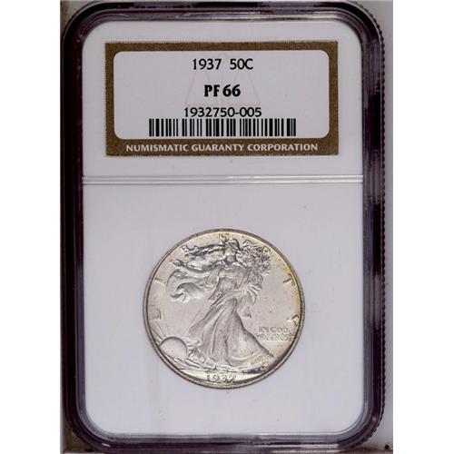 <B>1937 Proof Set PR64 to PR66 NGC.</B></I> The set includes: <B>Cent PR64 Red,</B></I> essentially brilliant orange with splashes of dark toning; <B>Nickel PR65,</B></I> faint cameo contrast with a hint of color; <B>Dime PR66,</B></I> wispy champagne toning over brilliantly mirrored surfaces; <B>Quarter PR66,</B></I> fully reflective surfaces are subdued by a trace of toning; and a <B>Half Dollar PR66,</B></I> light champagne color with a hint of olive toning at the border. <BR><BR><B>I