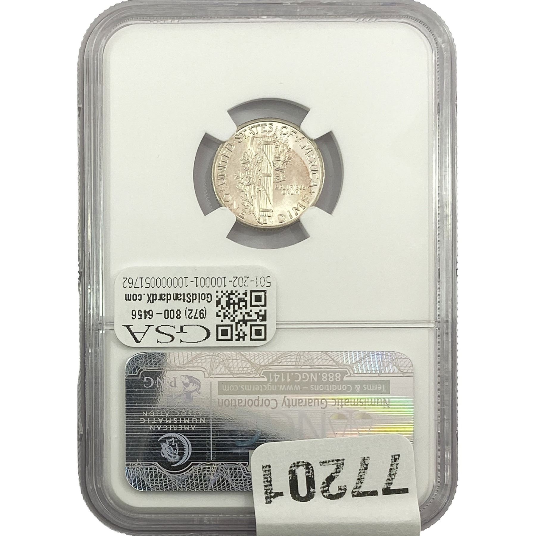e. Coins sold referencing a third-party grading service are sold “AS IS” without any express or implied warranty, except for a guarantee by GSA that they are genuine. Removal or alteration of the holder, voids all of Bidder’s claims concerning that Product. Certain warranties may be available from the grading services and Bidders are referred to them for further details: Numismatic Guaranty Corporation (NGC), PO Box 4776, Sarasota, FL 34230, www.ngccoin.com/services/writtenguarantee.asp; Professional Coin Grading Services (PCGS), PO Box 9458, Newport Beach, CA 92658, www.pcgs.com/guarantee.html; ANACS, 6555 S. Kenton St., Ste. 303, Englewood, CO 80111; and Independent Coin Grading Co. (ICG), 7901 East Bellview, Ave., Suite 50, Englewood, CO 80111.