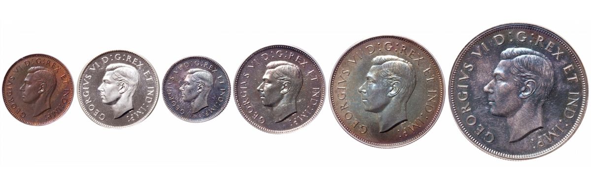 1937 Mirror Specimen Set. Cent through Dollar. A gem set, all PCGS graded. One Cent. Specimen-66. Red-Brown; Five Cents. Specimen-67, with a Heavy Cameo contrast; Ten Cents. Specimen-65; Twenty-Five Cents. Specimen-65; Fifty Cents. Specimen-65; $1.00. Specimen-65. The silver coins with medium to heavy blue-gray toning. A scarce Gem set. Ex. Heritage. Lot #12215.