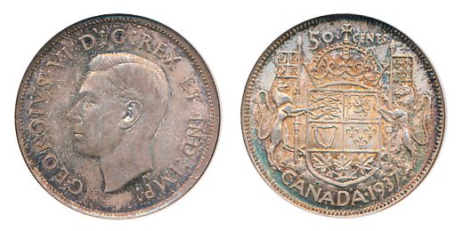 1937, NGC graded Mint State-64. Medium heavy, iridescent rainbow toning.