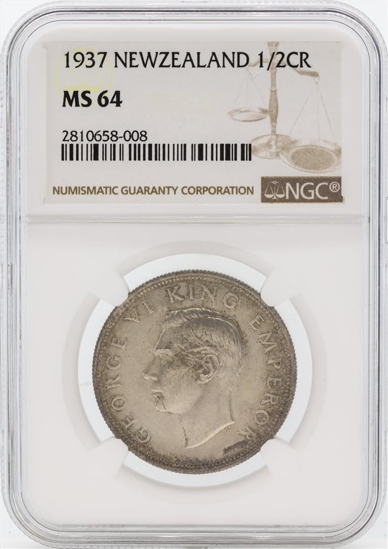 One 1937 Newzealand 1/2 Crown Silver Coin NGC MS64. NGC Certified.