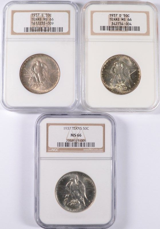 1937 (P, D, S) TEXAS COMMEN HALF DOLLARS NGC MS-66