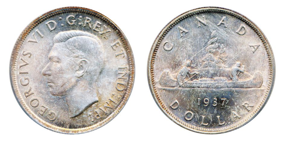 1937. PCGS graded Mint State-65. A rare gem. Gorgeous light rainbow toning, predominated by hues of pinks and golds.