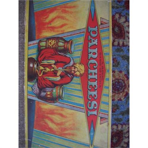 The heavy cardboard board of this old game tells that it was made by Selchow & Richter, Trade Mark Registered in U.S., March 1874; Re-registed Oct. 8 1918; Reistered in Canada March 21, 1890. The board is in near mint condition. This game is the revised 1937 edition. Inside are the colored "chips" with brass surrounds (4 pink, 4 blue, 4 green, 4 yellow), 2 dice shakers and 1 wooden round container, and 8 dice. The price tag on the box shows that it originally sold for 89 cents. The exotic picture on the box of the Indian snake charmer is bright and vivid. The box top is in good repair but for one corner where the seam is split vertically and extending about 8 inches on one side horizontally, and a little wear on the edges & corners. The box bottom has 2 splits on the seam, each about 2 inches long, a nick on the top edge, and some wear along the seams.