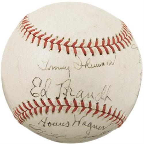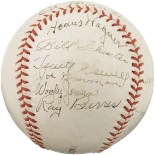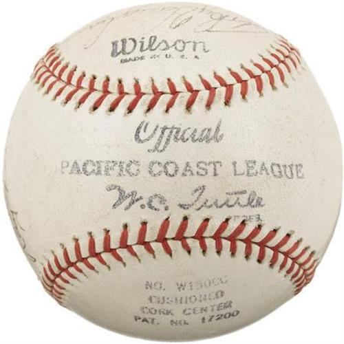 <B>1937 Pittsburgh Pirates Partial Team Signed Baseball with Wagner & Vaughan.</B></I> Though just eleven autographs inhabit the pearly white surface of this Official Pacific Coast League orb, two of them stand more than a cut above the rest in terms of value and collectibility. Each at the top of his respective panel are the ageless legend Honus Wagner, and fellow Hall of Fame Pirates shortstop Arky Vaughan, whose accidental early death over three decades before his induction makes his signature even tougher than that of his esteemed predecessor. Other names include Schuster, Berres and Bowman. All autographs rate at an impressive strength of 7/10 or better. A clean and exotic beauty. <I>LOA from PSA/DNA. LOA from James Spence Authentication.</B></I><BR><BR><b>Shipping:</b> Balls, Pucks, etc., Small (<a target="_blank" href="http://www.heritageauctions.com/common/shipping.php">view shipping information</a>)