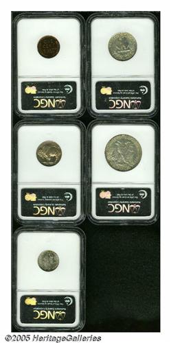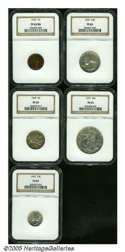 <B>1937 Proof Set PR65 to PR67 NGC.</B></I> The set includes: <B>Cent PR65 Red and Brown,</B></I> deep cherry-red color with deep reflectivity in the fields; <B>Nickel PR65,</B></I> nicely struck, pink and olive toning, mark-free; <B>Dime PR67,</B></I> cream-gray color, faint speckled patina, well struck; <B>Quarter PR65,</B></I> a coating of milky toning covers each side, there is a wispy lint mark (as struck) on Washington's jaw; and a <B>Half Dollar PR65,</B></I> well struck, carefully preserved, milky pearl-gray color and sky-blue accents on the obverse.