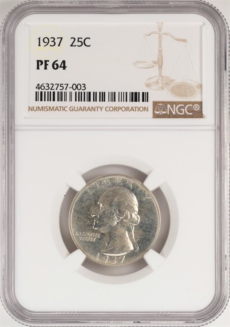 One 1937 Proof Washington Quarter Coin NGC PF64. NGC Certified.