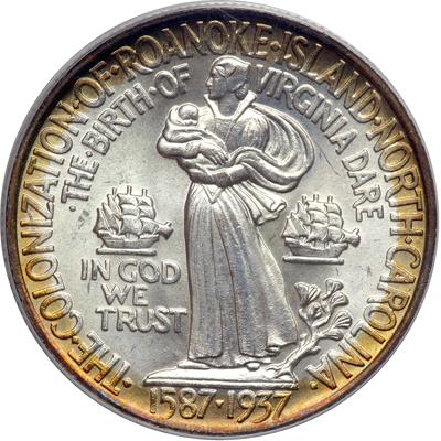 1937 Roanoke Half Dollar. PCGS graded MS-67. Lovely golden toning around the edges on both sides. Probably stored in an original paper holder as issued. The centers are brilliant, snowy white, and superb. Pop 237; 12 finer. (PCGS # 9367).