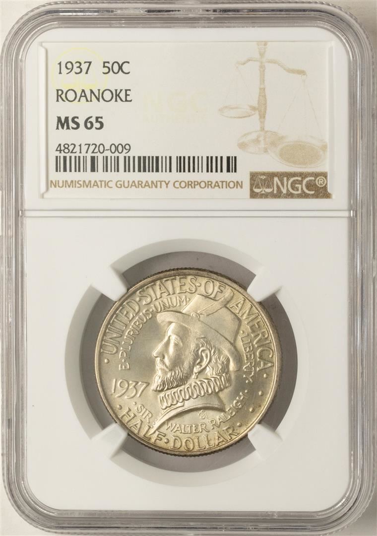One 1937 Roanoke Commemorative Half Dollar Coin NGC MS65. NGC Certified.
