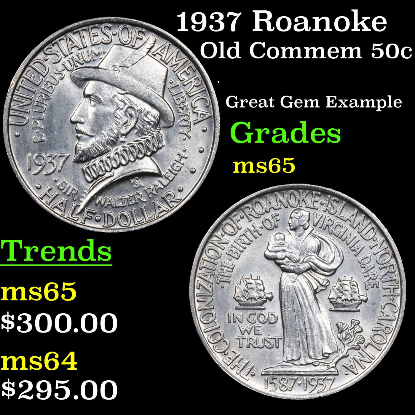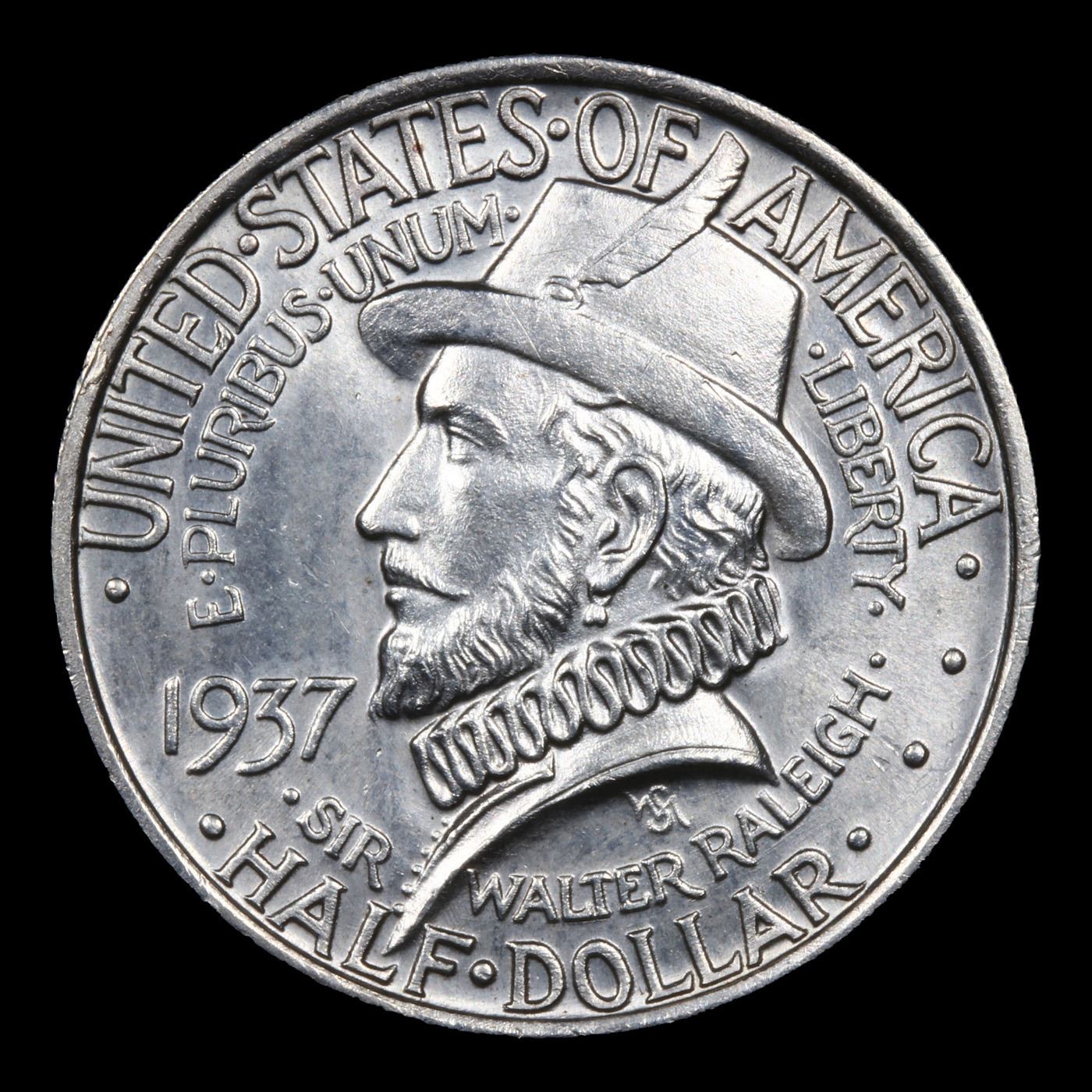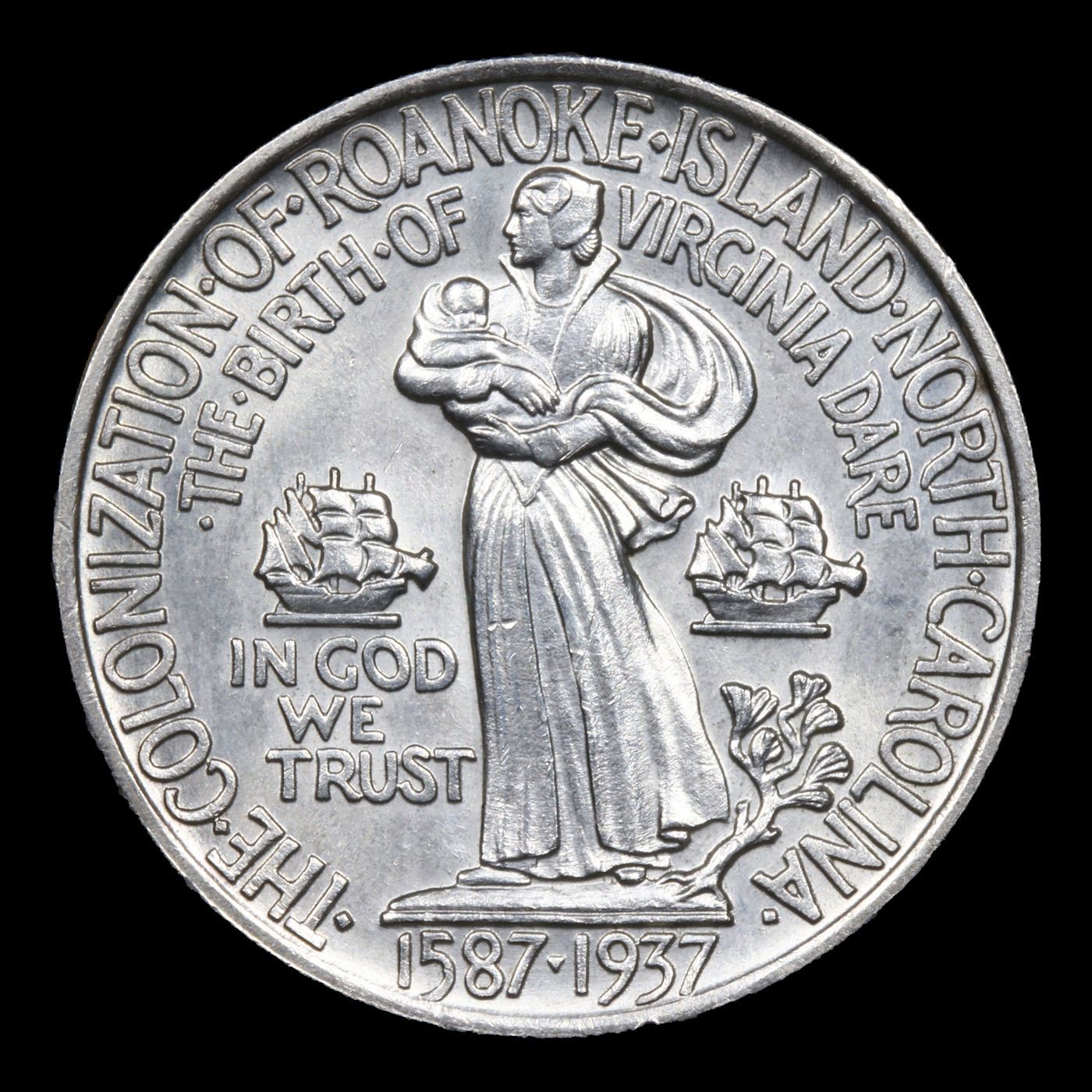 1937 Roanoke Old Commem Half Dollar 50c Grades GEM Unc. Low mintage of only 29,030 pieces! A silver commemorative coin was authorized to mark the 350th anniversary of the establishment of Roanoke Colony. This early attempt to establish a permanent English settlement in America became known as the Lost Colony when all of the inhabitants mysteriously vanished.The obverse of the 1937 Roanoke Half Dollar features a profile portrait of Sir Walter Raleigh, who had been granted the charter for colonization by Queen Elizabeth I.On the reverse is an image of Ellinore Dare and her child Virginia Dare, who was the first child born in America to English parents. To each side are sailing ships and below is a pine branch. The coins were designed by William Marks Simpson, who had also designed the Antietam Half Dollar and the Norfolk Half Dollar with his wife.Under the authorizing legislation, the Roanoke Half Dollars had a minimum mintage of 25,000 pieces and no established maximum. A total of 50,000 pieces were struck at the Philadelphia Mint in two batches. The coins were distributed through the Roanoke Colony Memorial Association of Manteo at an issue price of $1.65. Although sales levels exceeded the number of coins sold for other recent issues, eventually a large portion of the production was returned for melting, resulting in net distribution of 29,030.