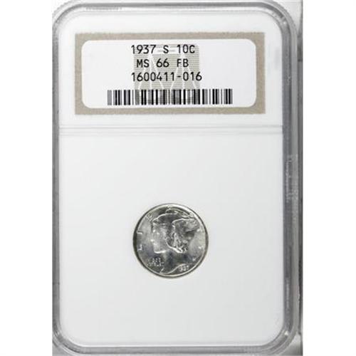 <B>1937-S 10C MS66 Full Bands NGC.</B></I> NGC Census: (84/32). PCGS Population (227/71). Mintage: 9,740,000. Numismedia Wsl. Price for NGC/PCGS coin in MS66: $260. (#5009)<BR><BR><B>Coin Engraver:</B> Adolph A. Weinman<BR><BR><b>Shipping:</b> Coins & Currency (<a target="_blank" href="http://www.heritageauctions.com/common/shipping.php">view shipping information</a>)