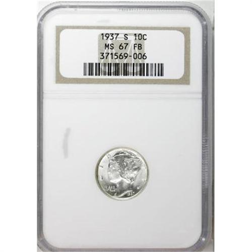 <B>1937-S 10C MS67 Full Bands NGC.</B></I> NGC Census: (32/0). PCGS Population (70/1). Mintage: 9,740,000. Numismedia Wsl. Price for NGC/PCGS coin in MS67: $1,075. (#5009)<BR><BR><B>Coin Engraver:</B> Adolph A. Weinman<BR><BR><b>Shipping:</b> Coins & Currency (<a target="_blank" href="http://www.heritageauctions.com/common/shipping.php">view shipping information</a>)