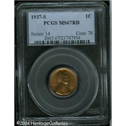 1937-S 1C MS67 Red PCGS. A boldly struck and unabr <B>1937-S 1C MS67 Red PCGS.</B></I> A boldly struck and unabraded Superb Gem that has lovely apricot and olive colors. A few nearly microscopic carbon flecks do not affect the eye appeal. <BR><BR><B>Important notice:</B> Heritage usually auctions material at the rate of 200-250 lots per hour. On some occasions eBay Live bid software or the Internet may not be able to keep up with the pace of the auction. We recommend placing a realistic absentee bid now as insurance to avoid disappointment. Occasionally the auctioneer may eliminate or reject an eBay Live bid, and the auctioneer may also reopen a lot after the close of the eBay live bidding (usually because we missed an audience bid), and may reject your bid even if it shows you as the winning bidder. By bidding via eBay Live, you agree that Heritage may award the lot to another bidder at its sole discretion under the circumstances described above or any other reasonable circumstances. Since eBay bids are not shown to us until we open the lot on the floor, we treat those bids just like floor bids. In most cases the floor responds before the eBay bid is presented to us, due to Internet lag time, so for consistency we have made it a policy that floor bids are always considered first over tie eBay live bids. Also please note that all Heritage lots purchased through eBay Live carry a 20% Buyer's Premium. Please make sure you read the Terms and Conditions before you bid. This lot is being auctioned in conjunction with a live floor auction by Heritage Galleries & Auctioneers. All final auction and invoice information will be supplied by Heritage Galleries & Auctioneers, and all other information should be considered preliminary. Lot:5342