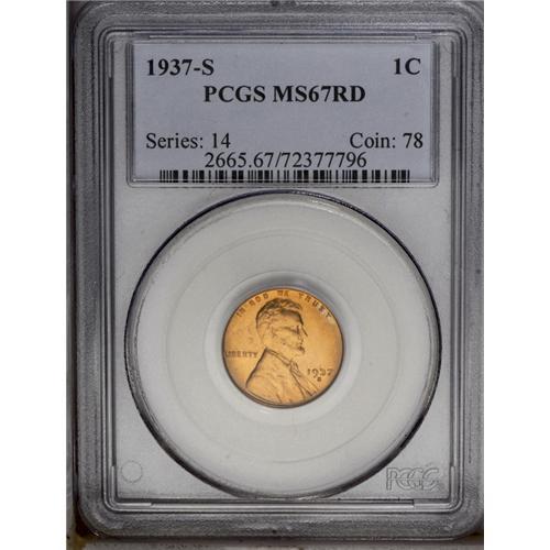 <B>1937-S<1C> MS67 Red PCGS.</B></I> Well struck with unusually bright orange-red color, pleasing luster, and just a couple of small contact marks on Lincoln's coat. A beautiful, wonderfully preserved Superb Gem. Population: 114 in 67, 0 finer (3/06).<BR><I>From The Kendall Marie #4 All-Time Finest PCGS Registry of Lincoln Cents with Varieties, Circulation Strikes, 1909-1958.</B></I> <BR><BR><B>Important notice:</B> Heritage usually auctions material at the rate of 200-250 lots per hour. On some occasions eBay Live bid software or the Internet may not be able to keep up with the pace of the auction. We recommend placing a realistic absentee bid now as insurance to avoid disappointment. Occasionally the auctioneer may eliminate or reject an eBay Live bid, and the auctioneer may also reopen a lot after the close of the eBay live bidding (usually because we missed an audience bid), and may reject your bid even if it shows you as the winning bidder. By bidding via eBay Live, you agree that Heritage may award the lot to another bidder at its sole discretion under the circumstances described above or any other reasonable circumstances. Since eBay bids are not shown to us until we open the lot on the floor, we treat those bids just like floor bids. In most cases the floor responds before the eBay bid is presented to us, due to Internet lag time, so for consistency we have made it a policy that floor bids are always considered first over tie eBay live bids. Also please note that all Heritage lots purchased through eBay Live carry a 20% Buyer's Premium. Please make sure you read the Terms and Conditions before you bid. This lot is being auctioned in conjunction with a live floor auction by Heritage Galleries & Auctioneers. All final auction and invoice information will be supplied by Heritage Galleries & Auctioneers, and all other information should be considered preliminary. Lot:546 <BR><BR><B>Winning Notification and Billing:</B> After the FINAL session in this auction is complete, Heritage will send e-mail and snail mail invoices. This process normally takes several days. All final auction and invoice information will be supplied by Heritage Galleries & Auctioneers, and all other information should be considered preliminary. <BR><BR>This auction will be conducted on a live auction floor and over the Internet through eBay Live. If you choose to place an absentee bid, please take a moment to <font color='#0000ff'><u><a href='http://pages.ebay.com/liveauctions/help/before/laabsentee.html'>learn how eBay Live absentee bidding works</a></u></font><font color='#000000'>