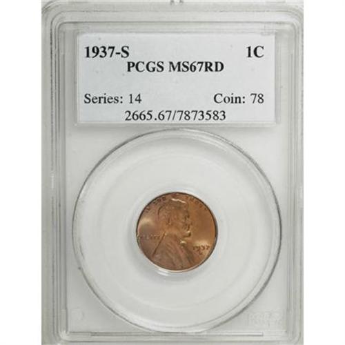<B>1937-S 1C MS67 Red PCGS.</B></I> . PCGS Population (117/0). NGC Census: (338/0). Mintage: 34,500,000. Numismedia Wsl. Price for NGC/PCGS coin in MS67: $180. (#2665)<BR><BR><B>Coin Engraver:</B> Victor D. Brenner<BR><BR><b>Shipping:</b> Coins & Currency (<a target="_blank" href="http://www.heritageauctions.com/common/shipping.php">view shipping information</a>)