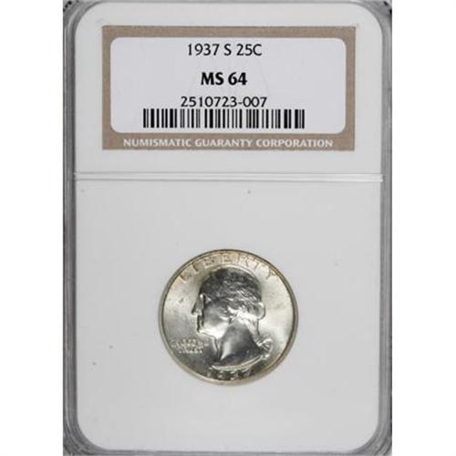 <B>1937-S 25C MS64 NGC.</B></I> NGC Census: (248/406). PCGS Population (649/631). Mintage: 1,652,000. Numismedia Wsl. Price for NGC/PCGS coin in MS64: $192. (#5805)<BR><BR><B>Coin Engraver:</B> John Flanagan<BR><BR><b>Shipping:</b> Coins & Currency (<a target="_blank" href="http://www.heritageauctions.com/common/shipping.php">view shipping information</a>)