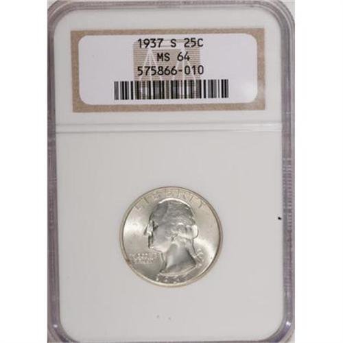 <B>1937-S 25C MS64 NGC.</B></I> NGC Census: (259/420). PCGS Population (668/651). Mintage: 1,652,000. Numismedia Wsl. Price for NGC/PCGS coin in MS64: $220. (#5805)<BR><BR><B>Coin Engraver:</B> John Flanagan<BR><BR><b>Shipping:</b> Coins & Currency (<a target="_blank" href="http://www.heritageauctions.com/common/shipping.php">view shipping information</a>)