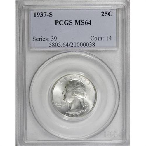 <B>1937-S 25C MS64 PCGS.</B></I> PCGS Population (655/640). NGC Census: (252/410). Mintage: 1,652,000. Numismedia Wsl. Price for NGC/PCGS coin in MS64: $192. (#5805)<BR><BR><B>Coin Engraver:</B> John Flanagan<BR><BR><b>Shipping:</b> Coins & Currency (<a target="_blank" href="http://www.heritageauctions.com/common/shipping.php">view shipping information</a>)