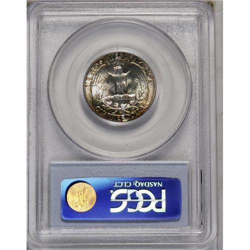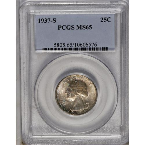 <B>1937-S<25C> MS65 PCGS.</B></I> Mottled peach-lilac toning blankets the obverse, the reverse is much lighter with speckled shades of green, gold, and reddish-russet. A carefully preserved Gem example.