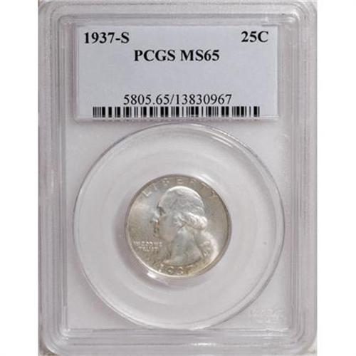 <B>1937-S 25C MS65 PCGS.</B></I> PCGS Population (469/148). NGC Census: (262/139). Mintage: 1,652,000. Numismedia Wsl. Price for NGC/PCGS coin in MS65: $260. (#5805)<BR><BR><B>Coin Engraver:</B> John Flanagan<BR><BR><b>Shipping:</b> Coins & Currency (<a target="_blank" href="http://www.heritageauctions.com/common/shipping.php">view shipping information</a>\)