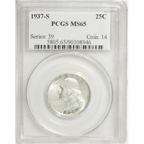 <B>1937-S 25C MS65 PCGS.</B></I> PCGS Population (481/156). NGC Census: (267/139). Mintage: 1,652,000. Numismedia Wsl. Price for NGC/PCGS coin in MS65: $260. (#5805)<BR><BR><B>Coin Engraver:</B> John Flanagan<BR><BR><b>Shipping:</b> Coins & Currency (<a target="_blank" href="http://www.heritageauctions.com/common/shipping.php">view shipping information</a>)