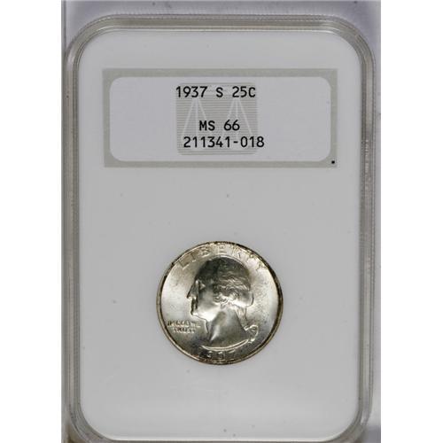<B>1937-S<25C> MS66 NGC.</B></I> Potent luster and iridescent powder-blue and chestnut toning proclaim the eye appeal of this lustrous Premium Gem. Exceptional quality for the grade. Encased in an older generation NGC holder.
