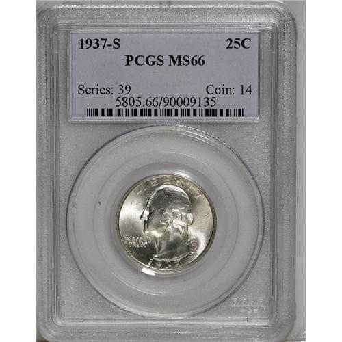 <B>1937-S<25C> MS66 PCGS.</B></I> A frosty piece with only small spots of milky toning on the obverse. Sharply struck for the issue with only tiny, trivial marks in the fields.
