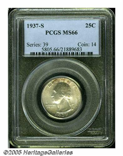 <B>1937-S<25C> MS66 PCGS.</B></I> Exceptionally lustrous and lightly toned over each side. A lovely S-mint quarter from the 1930s. Population: 120 in 66, 11 finer (3/05).