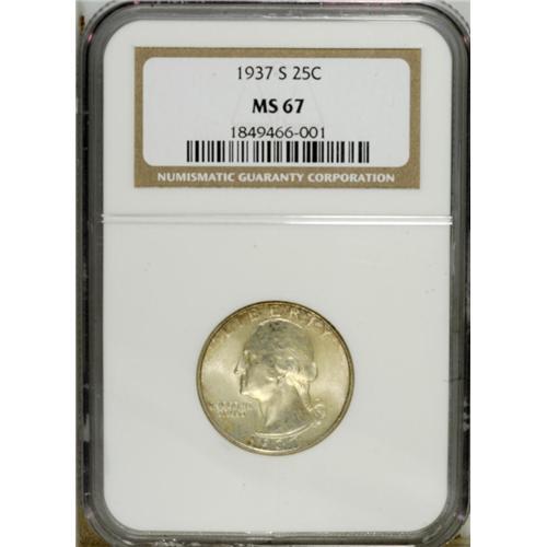 <B>1937-S 25C MS67 NGC.</B></I> Pale gold and cream blend throughout this thoroughly lustrous and unmarked Superb Gem. The strike is intricate, even on the often soft peripheral legends. The lowest mintage issue of the business strike series, apart from the 1932-D and 1932-S keys. Census: 24 in 67, 0 finer (1/07).<BR><BR><b>Shipping:</b> Coins & Currency (<a target="_blank" href="http://www.heritageauctions.com/common/shipping.php">view shipping information</a>)