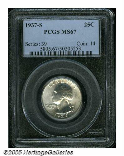 <B>1937-S<25C> MS67 PCGS.</B></I> An extraordinary snowy-white representative that only upon close inspection reveals a few inconsequential marks on the eagle. The low mintage 1937-S has long been a semi-key within the Washington Quarter series, and this Superb example is among the nicest we have seen. Population: 23 in 67, 0 finer (5/05).