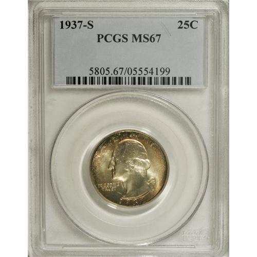 <B>1937-S 25C MS67 PCGS.</B></I> Vibrant golden-russet and jade-green margins surround brilliant centers. A lustrous Superb Gem with a penetrating strike and essentially pristine preservation. The lowest mintage issue aside from the two first-year keys. Population: 19 in 67, 0 finer (2/07).<BR><BR><b>Shipping:</b> Coins & Currency (<a target="_blank" href="http://www.heritageauctions.com/common/shipping.php">view shipping information</a>)