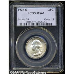 <B>1937-S<25C> MS67 PCGS.</B></I> Highly lustrous, and lightly toned in dappled olive, sea-green, and reddish-gold colors over limited areas. The design features are well struck, and a couple of small marks are noted on Washington's neck. Population: 11 in 67, 0 finer (7/04). <BR><BR><B>Important notice:</B> Heritage usually auctions material at the rate of 200-250 lots per hour. On some occasions eBay Live bid software or the Internet may not be able to keep up with the pace of the auction. We recommend placing a realistic absentee bid now as insurance to avoid disappointment. Occasionally the auctioneer may eliminate or reject an eBay Live bid, and the auctioneer may also reopen a lot after the close of the eBay live bidding (usually because we missed an audience bid), and may reject your bid even if it shows you as the winning bidder. By bidding via eBay Live, you agree that Heritage may award the lot to another bidder at its sole discretion under the circumstances described above or any other reasonable circumstances. Since eBay bids are not shown to us until we open the lot on the floor, we treat those bids just like floor bids. In most cases the floor responds before the eBay bid is presented to us, due to Internet lag time, so for consistency we have made it a policy that floor bids are always considered first over tie eBay live bids. Also please note that all Heritage lots purchased through eBay Live carry a 20% Buyer's Premium. Please make sure you read the Terms and Conditions before you bid. </span></font></tr></table></td></tr></table>