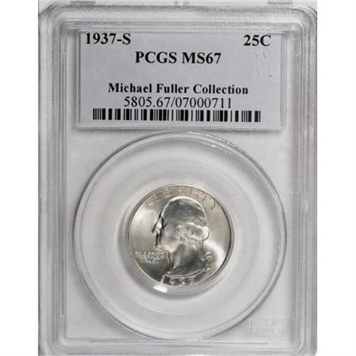 <B>1937-S 25C MS67 PCGS.</B></I> DDO-001. Lustrous and well preserved with attractive light olive-gold toning. The strike is sharp, both in the centers and along the borders. The 1937-S has the third lowest mintage of the series, and quality Superb Gems are under strong demand. Die doubling is noted on portions of IN GOD WE TRUST. Population: 20 in 67, 0 finer (10/07).<BR><I>From The Michael Fuller Collection.</B></I><BR><BR><B>Coin Engraver:</B> John Flanagan<BR><BR><b>Shipping:</b> Coins & Currency (<a target="_blank" href="http://www.heritageauctions.com/common/shipping.php">view shipping information</a>)