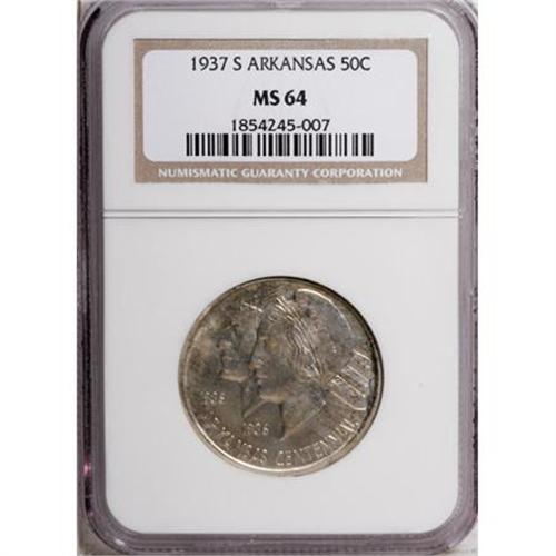 <B>1937-S 50C Arkansas MS64 NGC.</B></I> NGC Census: (271/187). PCGS Population (378/241). Mintage: 5,506. Numismedia Wsl. Price for NGC/PCGS coin in MS64: $112. (#9243)<BR><I>From The Frank DuVall Collection of U.S. Commemoratives.</B></I><BR><BR><b>Shipping:</b> Coins & Currency (<a target="_blank" href="http://www.heritageauctions.com/common/shipping.php">view shipping information</a>\)