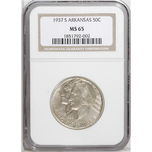 <B>1937-S<50C> Arkansas MS65 NGC.</B></I> This satiny Gem is a splendid example with fully brilliant obverse and reverse surfaces. subliminal toning is present on the obverse while the reverse has bright white surfaces.
