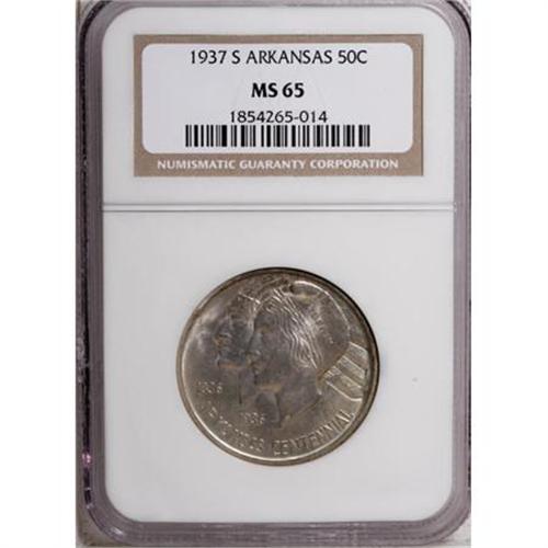 <B>1937-S 50C Arkansas MS65 NGC.</B></I> NGC Census: (156/31). PCGS Population (186/55). Mintage: 5,506. Numismedia Wsl. Price for NGC/PCGS coin in MS65: $340. (#9243)<BR><I>From The Frank DuVall Collection of U.S. Commemoratives.</B></I><BR><BR><b>Shipping:</b> Coins & Currency (<a target="_blank" href="http://www.heritageauctions.com/common/shipping.php">view shipping information</a>\)