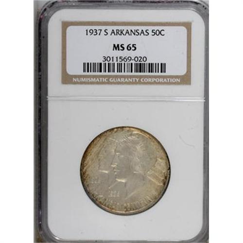 <B>1937-S 50C Arkansas MS65 NGC.</B></I> NGC Census: (157/31). PCGS Population (186/56). Mintage: 5,506. Numismedia Wsl. Price for NGC/PCGS coin in MS65: $340. (#9243)<BR><BR><b>Shipping:</b> Coins & Currency (<a target="_blank" href="http://www.heritageauctions.com/common/shipping.php">view shipping information</a>)