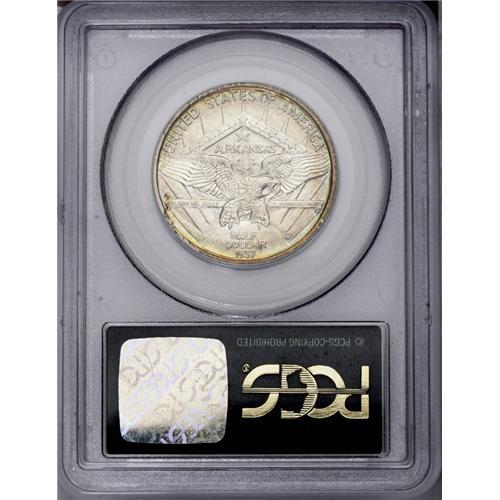 <B>1937-S<50C> Arkansas MS65 PCGS.</B></I> Thin bands of lime and gold enrich the reverse border. Well struck and unmarked with suitable satin luster. Housed in a green label holder.