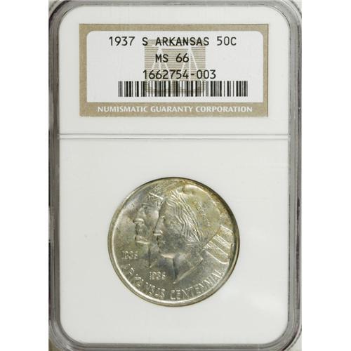 <B>1937-S 50C Arkansas MS66 NGC.</B></I> Soft ice-blue and gold-beige coloration is joined with freckles of olive-green. Radiantly lustrous surfaces exhibit well struck design elements, and are free of significant marks. Census: 28 in 66, 3 finer (3/07).<BR><BR><b>Shipping:</b> Coins & Currency (<a target="_blank" href="http://www.heritageauctions.com/common/shipping.php">view shipping information</a>)