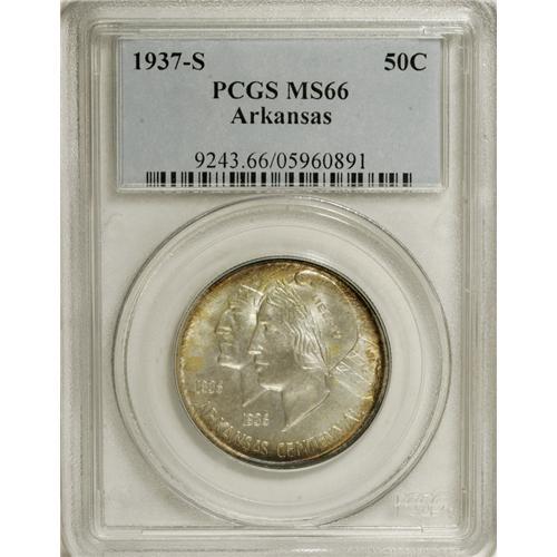 <B>1937-S 50C Arkansas MS66 PCGS.</B></I> Dappled tan-gold, ruby-red, and forest-green toning embraces the obverse border. The reverse displays speckled khaki-gold patina. Satiny and smooth with only faint contact on the Indian's cheekbone. Population: 51 in 66, 3 finer (2/07).<BR><BR><b>Shipping:</b> Coins & Currency (<a target="_blank" href="http://www.heritageauctions.com/common/shipping.php">view shipping information</a>)
