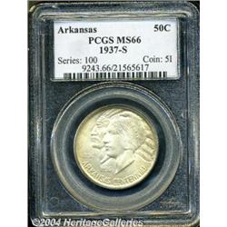 <B>1937-S<50C> Arkansas MS66 PCGS.</B></I> Light golden-brown toning, which is deeper on the reverse periphery, covers lustrous, relatively mark-free surfaces. Population: 38 in 66, 3 finer (3/04). <BR><BR><B>Important notice:</B> Heritage usually auctions material at the rate of 200-250 lots per hour. On some occasions eBay Live bid software or the Internet may not be able to keep up with the pace of the auction. We recommend placing a realistic absentee bid now as insurance to avoid disappointment. Occasionally the auctioneer may eliminate or reject an eBay Live bid, and the auctioneer may also reopen a lot after the close of the eBay live bidding (usually because we missed an audience bid), and may reject your bid even if it shows you as the winning bidder. By bidding via eBay Live, you agree that Heritage may award the lot to another bidder at its sole discretion under the circumstances described above or any other reasonable circumstances. Since eBay bids are not shown to us until we open the lot on the floor, we treat those bids just like floor bids. In most cases the floor responds before the eBay bid is presented to us, due to Internet lag time, so for consistency we have made it a policy that floor bids are always considered first over tie eBay live bids. Also please note that all Heritage lots purchased through eBay Live carry a 20% Buyer's Premium. Please make sure you read the Terms and Conditions before you bid.