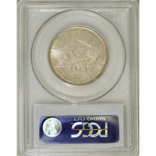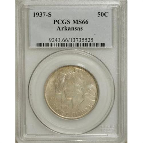 <B>1937-S 50C Arkansas MS66 PCGS.</B></I> The Arkansas is one of the most challenging type coins in the commemorative series. However, the 1937-S is one of the more available issues in this difficult type. The bright, satiny mint luster shines forcefully through the rose and lilac toning seen over each side. Sharply struck also. Population: 53 in 66, 3 finer (8/07).<BR><BR><b>Shipping:</b> Coins & Currency (<a target="_blank" href="http://www.heritageauctions.com/common/shipping.php">view shipping information</a>)