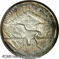 <B>1937-S 50C Arkansas MS67 PCGS.</B></I> Ex: JFS Collection, the #1 All-Time PCGS Registry Set. Peripheral accumulations of antique-gold, sky-blue, and aqua-marine colors yield to nearly untoned centers. Satiny luster flows unimpeded across the well preserved surfaces. A sharply struck and impressive Superb Gem that is clearly in the Condition Census for this often lackluster issue. Population: 3 in 67, 0 finer (1/05). Lot:8436