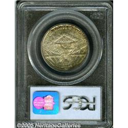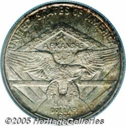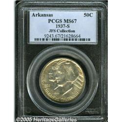 <B>1937-S 50C Arkansas MS67 PCGS.</B></I> Ex: JFS Collection. Golden-brown and baby-blue hues enrich the peripheries, while the remainder of the obverse is essentially untoned and the central reverse features faint lilac color. A suitably struck and shimmering Superb Gem with pleasing preservation and outstanding eye appeal. Originally issued only as part of a PDS set, just 5,506 1937-S Arkansas Halves were produced. High grade survivors are very rare, much of which has to do with the design. Liberty's cheek is especially prone to distracting marks, although the present piece is exemplary in this regard.
