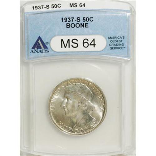 <B>1937-S 50C Boone MS64 ANACS.</B></I> NGC Census: (157/408). PCGS Population (184/348). Mintage: 2,506. Numismedia Wsl. Price for NGC/PCGS coin in MS64: $332. (#9272)<BR><BR><b>Shipping:</b> Coins & Currency (<a target="_blank" href="http://www.heritageauctions.com/common/shipping.php">view shipping information</a>\)