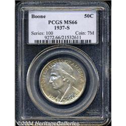<B>1937-S<50C> Boone MS66 PCGS.</B></I> This bright, satin-to-frosty Gem is overlaid in delicate pastel-apricot hues that are largely confined to the obverse. The finish is not all that common for the type, this feature further enhancing the desirability of this lot. <BR><BR><B>Important notice:</B> Heritage usually auctions material at the rate of 200-250 lots per hour. On some occasions eBay Live bid software or the Internet may not be able to keep up with the pace of the auction. We recommend placing a realistic absentee bid now as insurance to avoid disappointment. Occasionally the auctioneer may eliminate or reject an eBay Live bid, and the auctioneer may also reopen a lot after the close of the eBay live bidding (usually because we missed an audience bid), and may reject your bid even if it shows you as the winning bidder. By bidding via eBay Live, you agree that Heritage may award the lot to another bidder at its sole discretion under the circumstances described above or any other reasonable circumstances. Since eBay bids are not shown to us until we open the lot on the floor, we treat those bids just like floor bids. In most cases the floor responds before the eBay bid is presented to us, due to Internet lag time, so for consistency we have made it a policy that floor bids are always considered first over tie eBay live bids. Also please note that all Heritage lots purchased through eBay Live carry a 20% Buyer's Premium. Please make sure you read the Terms and Conditions before you bid.