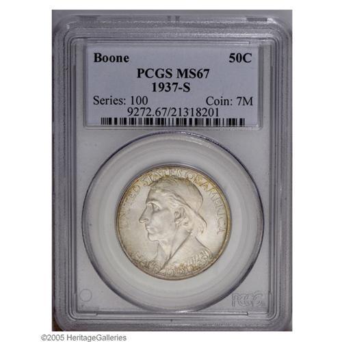 <B>1937-S<50C> Boone MS67 PCGS.</B></I> A wonderful vibrant obverse with mark free surfaces. The reverse is well struck and attractive. Hints of light green chiffon toning whisper at the edges.