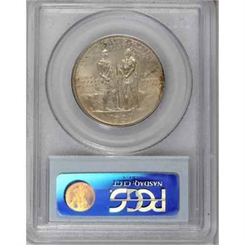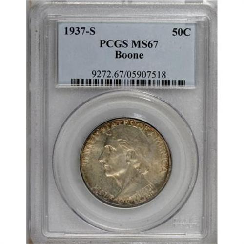 <B>1937-S 50C Boone MS67 PCGS.</B></I> From a scant mintage of 2,506 pieces, this is a conditionally scarce example that is virtually unobtainable any finer. Mottled violet, russet, and olive patina decorates the obverse periphery. Well struck with impressively clean surfaces, this is an exceptional representative of the Boone commemorative series. Population: 27 in 67, 1 finer (8/07). <BR><BR><b>Shipping:</b> Coins & Currency (<a target="_blank" href="http://www.heritageauctions.com/common/shipping.php">view shipping information</a>)